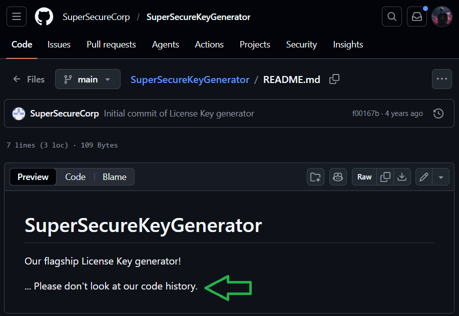 From the OSINT hunting using SuperSecure Corp there is a GitHub which seemed like a valuable find at first. It even said not to look at the repo history. That is a useful hint.