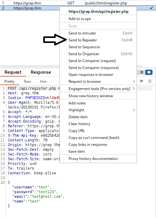 Using Burpsuite I captured an attempt to register but this time with the alternate api in hand, I use FoxyProxy to intercept and send it to repeater to input the api.
