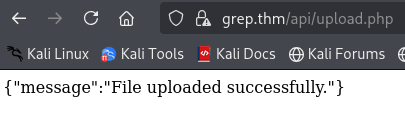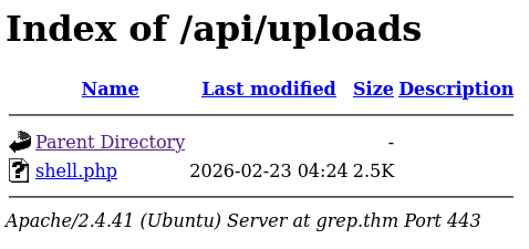 Now lets back it up and see if we can access grep.thm/api/uploads/ or just input grep.thm/api/uploads/shell.php with the Netcat listener running.