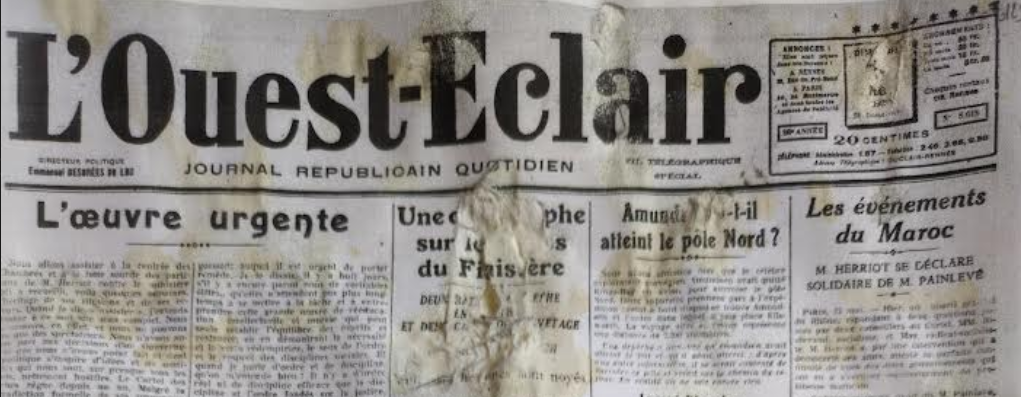 The newspaper masthead is still recognizable as L’Ouest-Éclair, which is enough to use as a historical research pivot. The clipping itself is too incomplete to recover the full article directly, so the practical next step is to correlate: